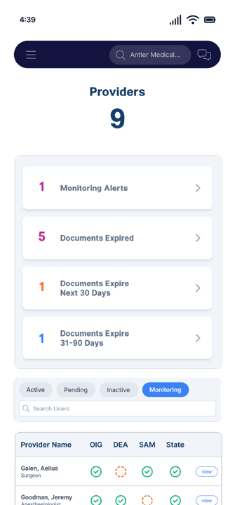 Automated checks of OIG, SAM, state. boards, DEA, and NPDB to ensure every provider is elegible to practice.